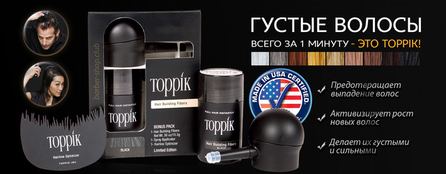 Американская компания Toppik Inc. основана в 1982 году. С тех пор более 3 миллионов мужчин и женщин по всему миру использовали продукты Toppik для придания объема волосам. Toppik преобразит вашу внешность за 30 секунд. Окружающие заметят увеличение объема ваших волос, но не факт использования продукта. Пудра Toppik устойчива к действиям дождя, ветра и потоотделению, но легко смывается шампунем.